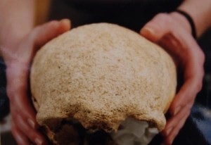 Jackie is holding the Archer’s left femur next to her own leg to show the curved shape of the bone. This was found to have been caused over a significant length of time, probably as a consequence of an injury to his left knee which resulted in the loss of his patella.